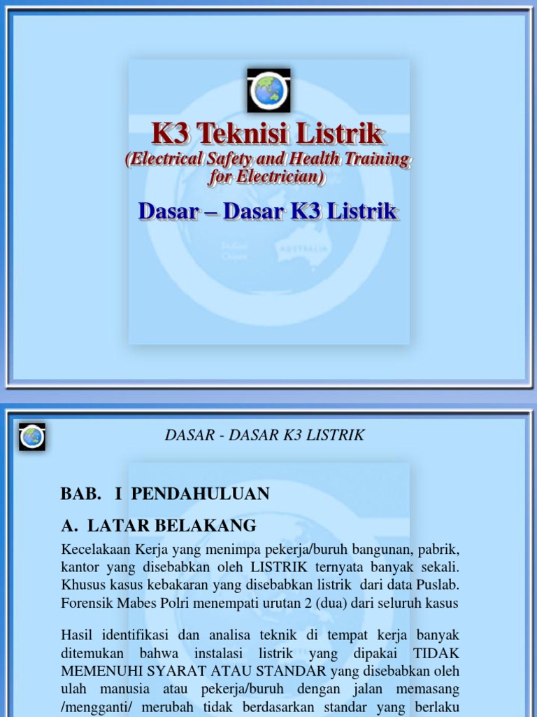 K3 Listrik / Keselamatan Kerja Listrik K3 Dalam Instalasi Listrik Pusat Pelatihan K3. Ruang lingkup yang termasuk dalam pelaksanaan k3 listrik di antaranya, perencanaan, pemasangan, penggunaan, perubahan, pemeliharaan, pemeriksaan dan pengujian. Untuk lebih mengenal lebih mendalam tentang k3 listrik, berikut ini telah kami sediakan materinya untuk kamu. Tersedianya pelatihan k3 listrik di perusahaan diharapkan mampu mengawasi pelaksanaan peraturan perundangan k3 di tempat kerja dan mampu memberikan peran optimal dalam organisasi perusahaan dalam mengendalikan resiko kecelakaan kerja. Calon ahli k3 listrik read more latar belakang listrik mengandung potensi bahaya yang dapat mengancam keselamatan tenaga kerja dan orang lain yang berada di dalam lingkungan tempat kerja, dan mengancam keamanan bangunan beserta isinya. Ruang lingkup (1) pelaksanaan k3 listrik merupakan pelaksanaan persyaratan k3 yang meliputi: